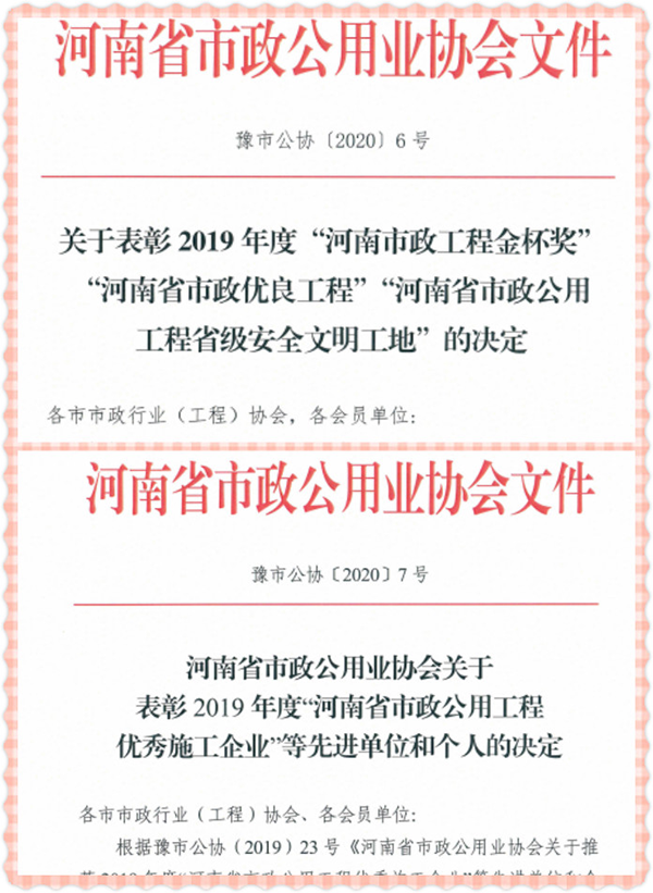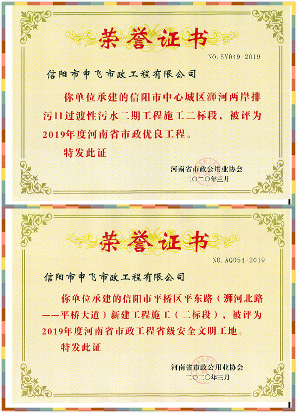 除省金杯獎之外,公司承建的中心城區(qū)浉河兩岸排污口過渡性污水污水二期工程二標(biāo)段被評為“河南省市政優(yōu)良工程”,平橋區(qū)平東路(浉河北路-平橋大道)新建工程(二標(biāo)段)被評為2019年度“市政工程省級安全文明工地”。